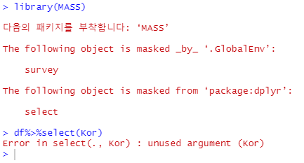 원인 : select함수가 MASS패키지와 dplyr패키지 둘다 있기 때문