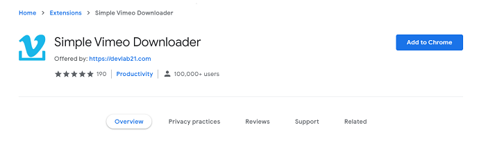 다음은 Simple Vimeo 다운로더입니다. 이 Chrome 확장 프로그램은 모든 Vimeo 동영상에 다운로드 버튼을 삽입하여 사용자가 직접 원할 때 Vimeo 동영상을 쉽게 다운로드할 수 있도록 도와줍니다. 플랫폼에서 공식적인 방법을 실행하지 않을 때 한 번의 클릭으로 Vimeo 비디오를 다운로드할 수 있는 가능성을 실현합니다.