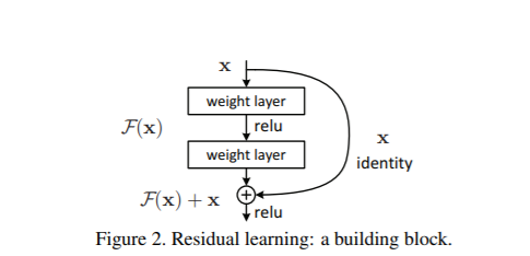 x 는 input인데 Model 인 F(x)라는 일련의 과정을 거치면서 자신(identity)인 x가 더해져서 output으로 F(x) + x 가 나오는 구조입니다.