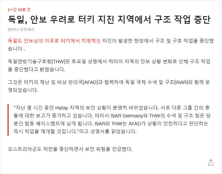 터키 내 단체 간의 극심한 갈등(약탈, 강도) 등으로 구조 활동이 불가능한 상황까지 다다른것 같아요