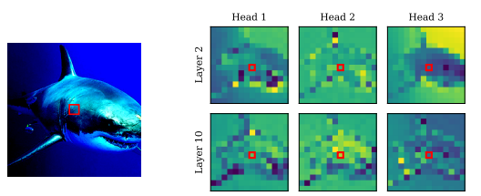 이는 convolution 의 channel 처럼 생각 할 수 있습니다. 다음 그림은 convit에서 여러 head간 attention map을 시각화 한 것입니다.