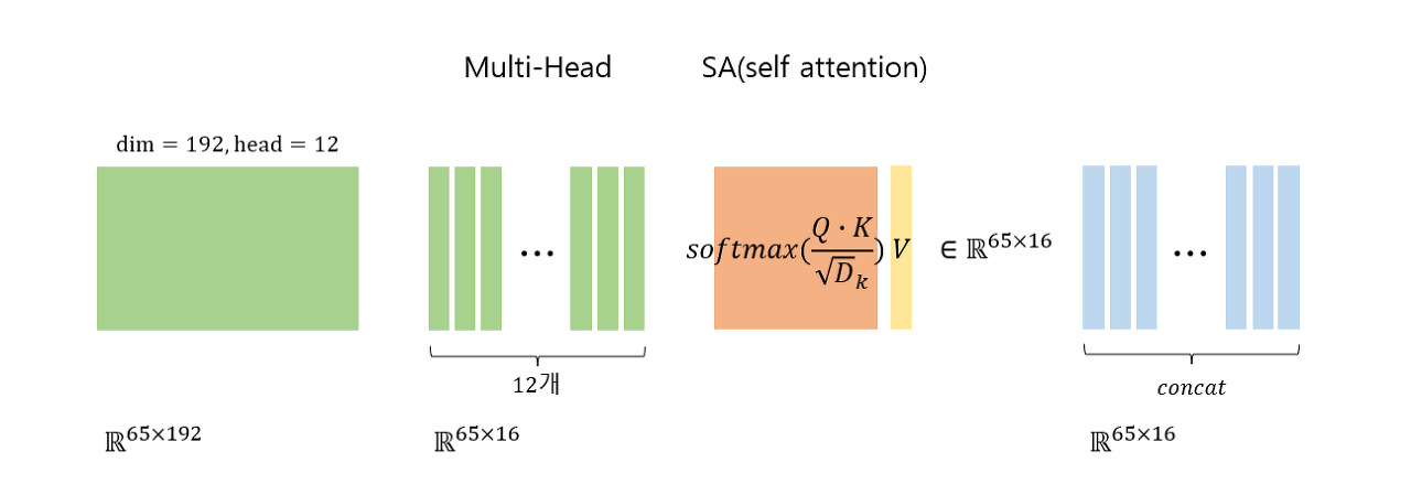 multi-head 의 개념의 핵심은 D(e.g.192)의 차원의 token을 head의 갯수로 나누어 head수 만큼 한 이미지(token)에 대하여 여러 관점을 볼 수 있다는 점 입니다.