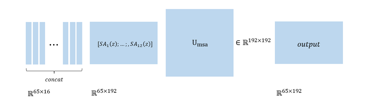 이후 Self Attention을 통과한 각 head의 값들은 concat이 되어서 마지막 linear projection()를 통해서 msa의 값이 나오게 됩니다.