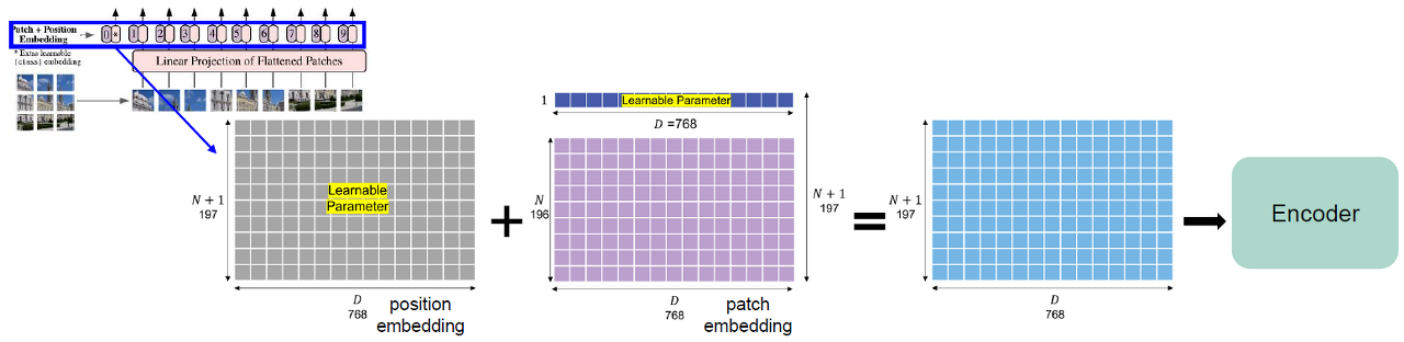 - N+1개의 학습 가능한 1D 포지션 임베딩 벡터 (이미지 패치의 위치를 특정하기 위함)를 만들어준 후, 이를 각 이미지 패치 벡터와 합해줌. (두 Matrix의 합)