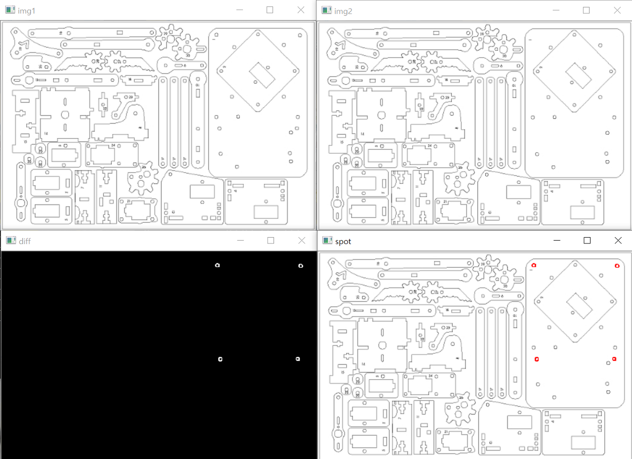정상 도면과 현재 도면을 빼기 연산해서 차이나는 부분을 알 수있습니다. 주로 불량품 검사, 틀린그림찾기 할때 많이 쓰이는 연산입니다.