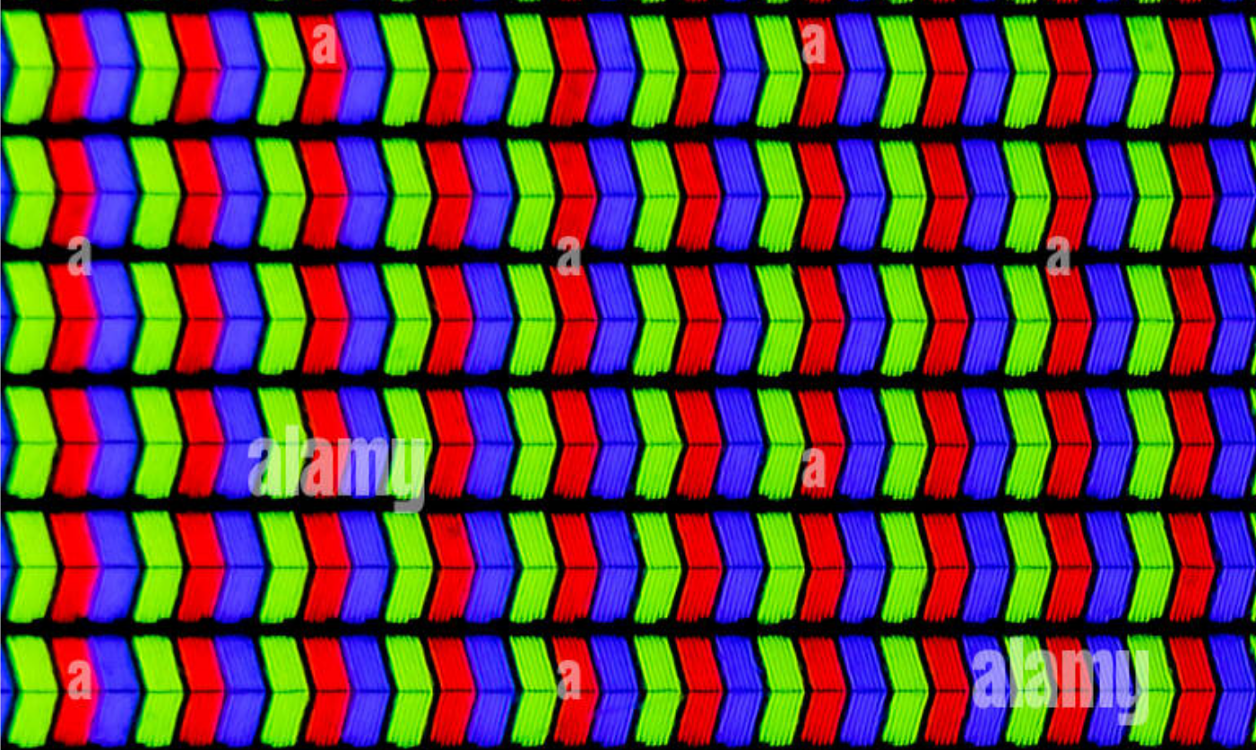 실제로 모니터나 티비를 확대해서 보면 이런 모습을 볼수있습니다. 한픽셀에 G(초록),R(빨강),B(파랑)이 들어가있습니다.