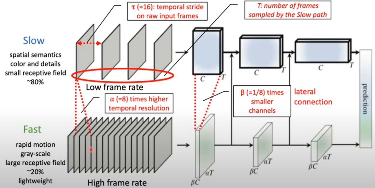 Image + Optical Flow 대신 Image + Image 를 입력해서 데이터를 처리합니다. 하나의 pathway는 16프레임마다 샘플링해서 입력(Low frame rate)으로 넣는다면 나머지 하나의 pathway는 2프레임마다 샘플링해서 입력(High frame rate)으로 넣는 형태로 양쪽 pathway의 프레임 입력에 대한 stride값을 다르게 설정하는 구조입니다. 즉, Low frame rate부분은 공간적 정보를 학습하고 Hight frame rate 부분은 시간적 정보를 주로 학습하게 됩니다.