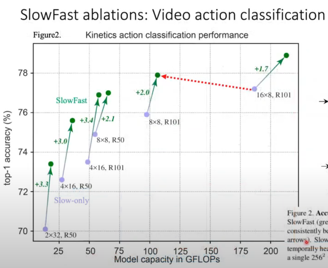 - 효과적인 학습: SlowFast 모델은 고해상도 느린 속도 인코더와 저해상도 빠른 속도 인코더 두 개의 네트워크로 구성되어 있으며, 이를 통해 학습에 사용되는 데이터의 양이 적어도 다른 모델들과 비교하여 학습에 더욱 효과적인 방법을 제공할 수 있습니다.