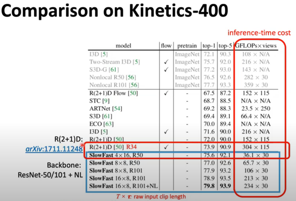 kinetics 400(사람 행동 400개 클래스, 각 클래스당 최소 400개의 비디오, 약 10초 길이, YouTube에서 가져옵니다. 동작은 인간에 초점을 맞추고 악수와 같은 인간과 인간의 상호 작용뿐만 아니라 악기 연주와 같은 인간과 개체의 상호 작용을 포함하여 광범위한 클래스를 포함합니다.) 데이터로 비교해보니 FAIR 다른 팀에서 발표한 R(2+1)D모델에 비해서 성능도, 연산량도 향상된것을 볼 수 있습니다.