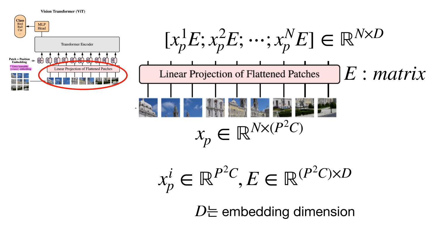 따라서 Xp의 shape은 (N,P^2 C), E의 shape은 (P^2 C, D)로 곱연산 하면 (N,D)의 크기를 가집니다.