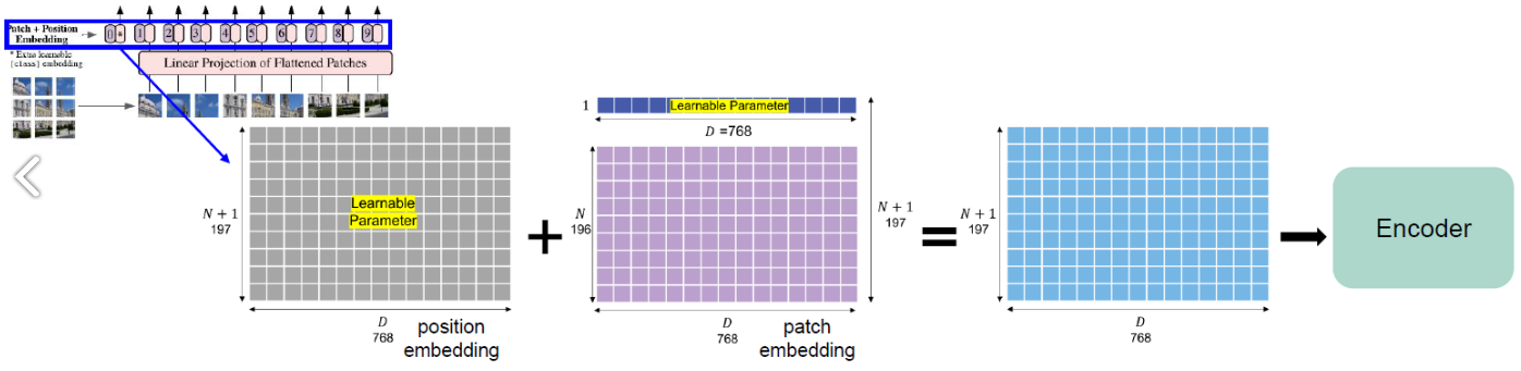 임베딩한 패치 앞에 학습 가능한(클래스 토큰) 임베딩 벡터를 붙여줍니다. 행렬이 (N+1, D)의 크기가 됩니다. 그리고 position encoding(이미지 패치의 위치를 특정하기 위해) 을 추가하기 위해 (N+1, D)의 크기의 벡터를 만들고 더해줍니다. 더한 결과 값은 입력값(z0)이 됩니다. 크기는 (196+1,768)이 됩니다.