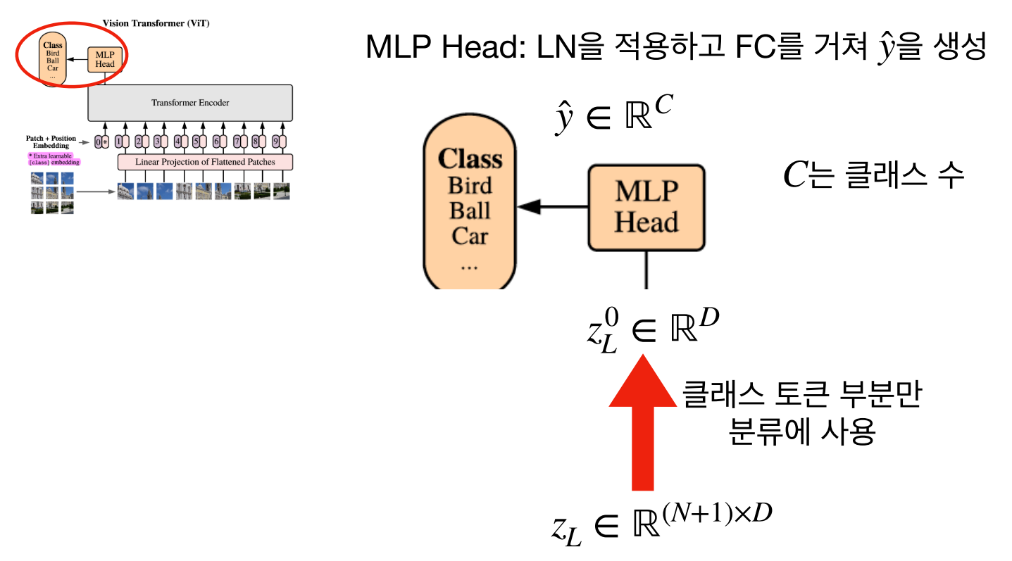 L번 반복한 Transformer Encoder의 마지막 출력에서 클래스 토큰 부분만 분류 문제에 사용하게 되며 마지막에 추가적인 MLP를 이용하여 클래스를 분류하게 됩니다.