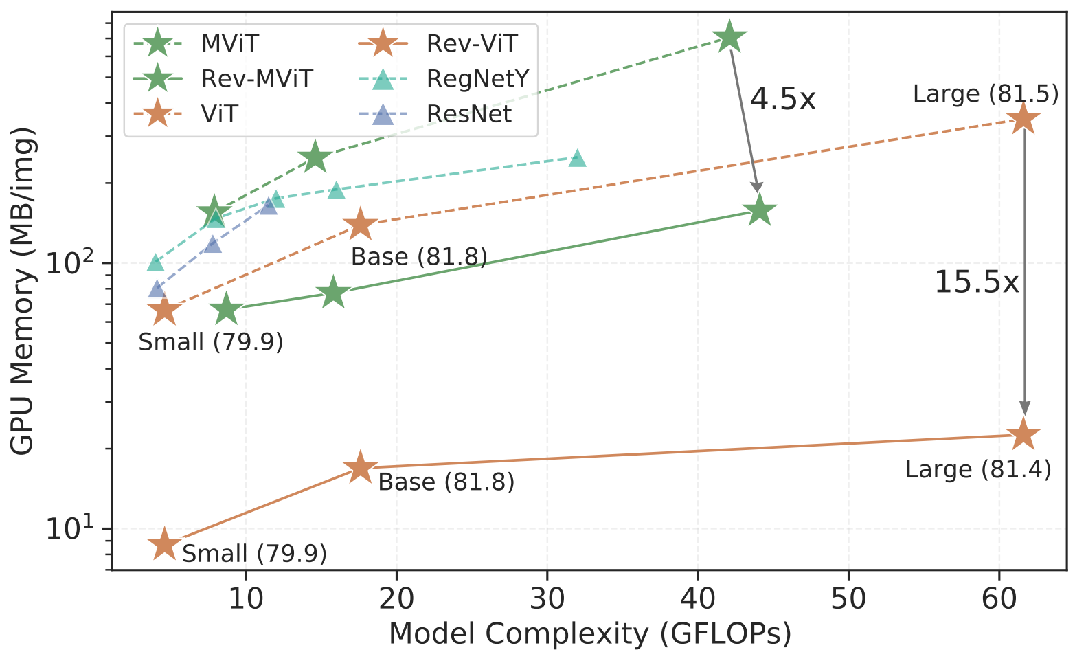 slowfast도 ViT모델을 사용하기 시작했는데 가장 최근에는 Reversible ViT모델을 사용했습니다. 기존 모델보다 GPU 메모리 사용량이 크게 줄은 것을 확인 할 수 있습니다.