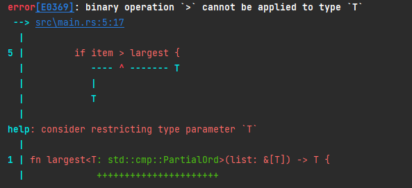 타입 T의 값을 비교하므로 이 값은 반드시 정렬 가능해야 한다. 표준 라이브러리는 비교 연산을 수행할 타입들은 std::cmp::PartialOrd 트레이트를 구현할 것을 요구한다.