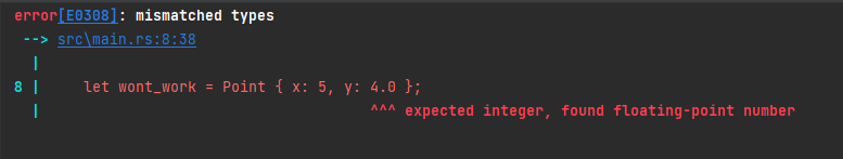 let wont_work = Point { x: 5, y: 4.0 };