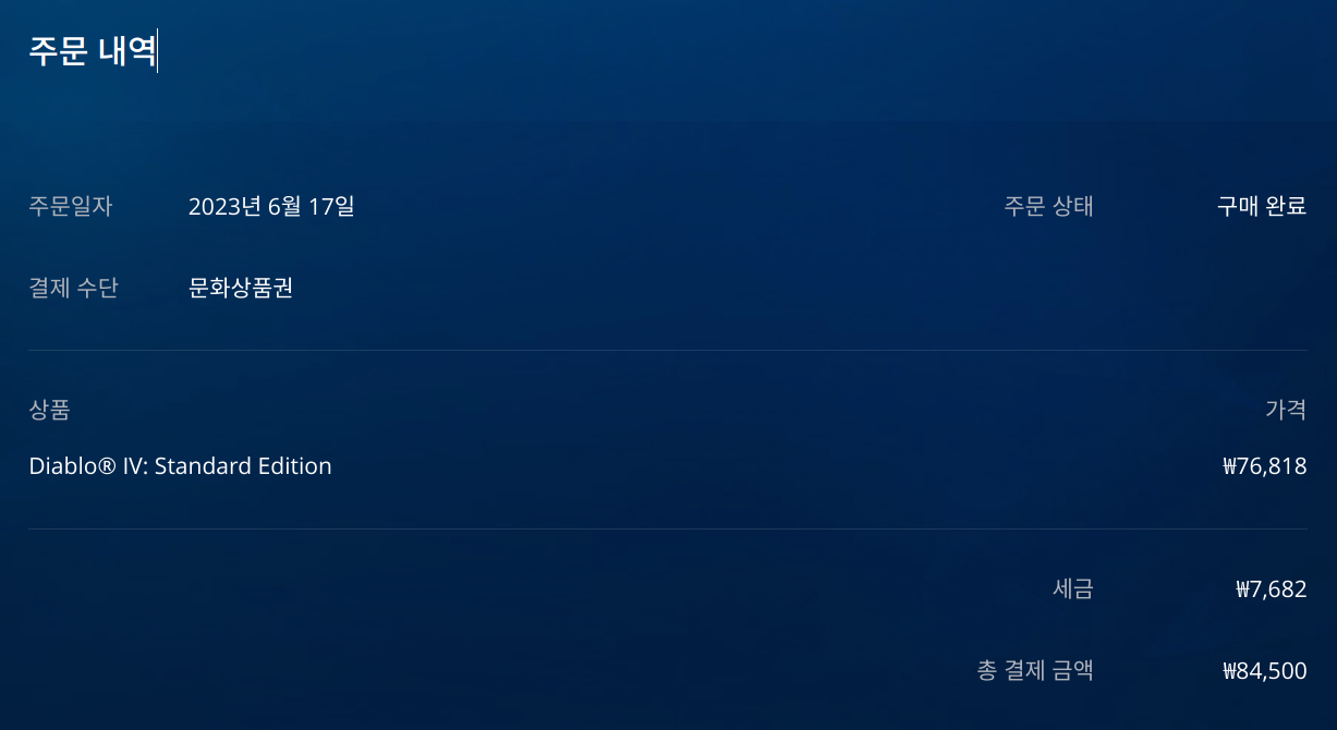 5만원권 두장을 약 9만2천원에 사서 디아블로4를 8만4500원에 결제하고 나머지 잔돈은 컬처랜드 잔고에 남아있습니다.