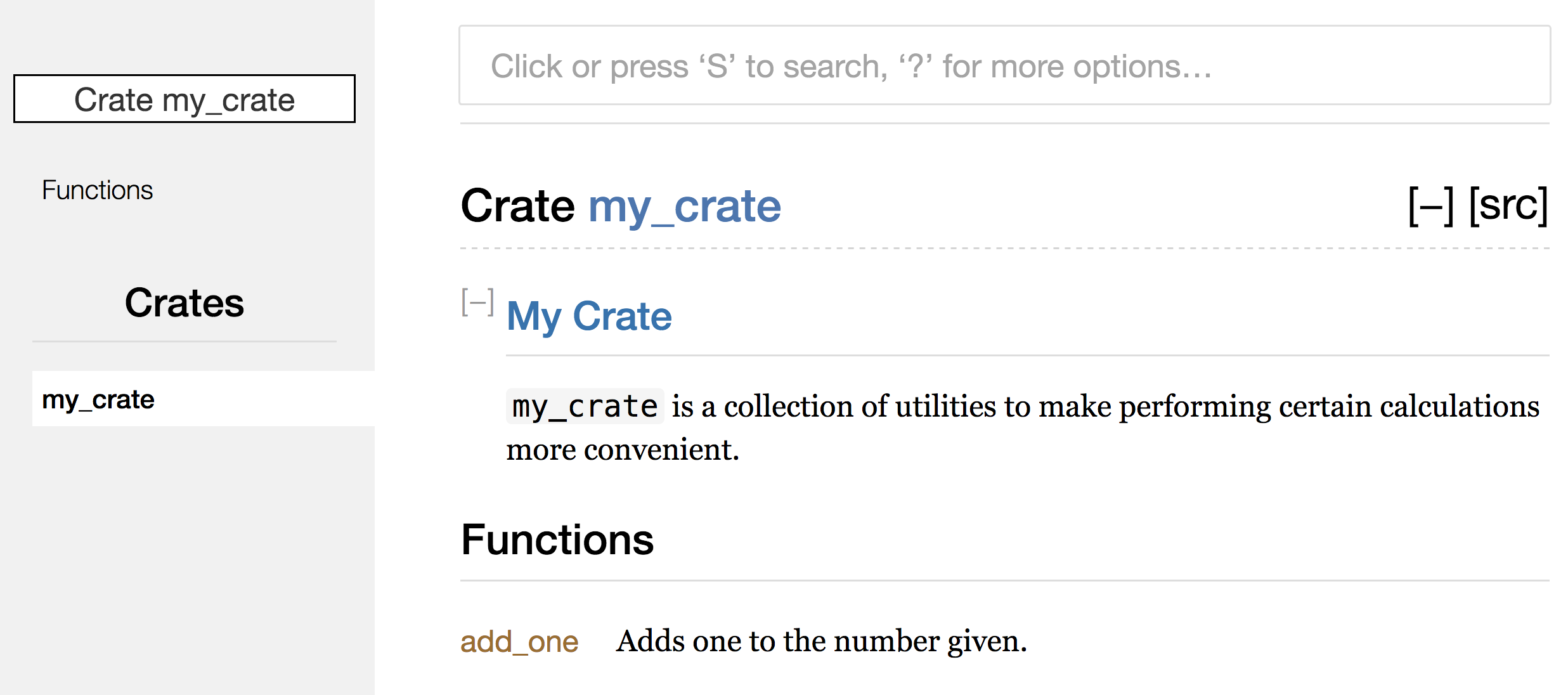 예시로, 만약 add_one 함수를 포함한 my_crate 크레이트를 설명하기 위한 목적으로 문서화를 진행한다면, src/lib.rs 에 //! 로 시작하는 문서화 주석을 추가할 수 있습니다.