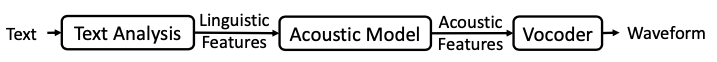 Acoustic Model과 Vocoder를 함께 학습하여 텍스트나 음소(phoneme)를 waverform 오디오로 바로 만들어주는 한번에 전부 하는 모델. 훈련단계를 구분할 필요도 없고 에러도 줄어듭니다. Acoustic model에 Text Analysis, Vocoder를 붙여서 End-to-End 방식이라고 부릅니다.