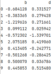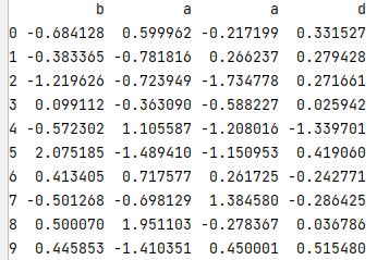 (10,4)데이터프레임 만들어서 컬럼명을 b,a,a,d로 설정