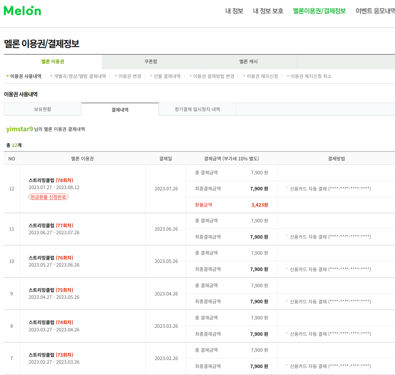 멜론은 그동안 등급 날리는게 아까워 유지를 하고있었지만 MVIP 헤택이 진짜 하나도 없고 노래도 많이 듣는편도 아니여서 해지해버렸습니다. 78개월을 썼네요. ㅎㅎ