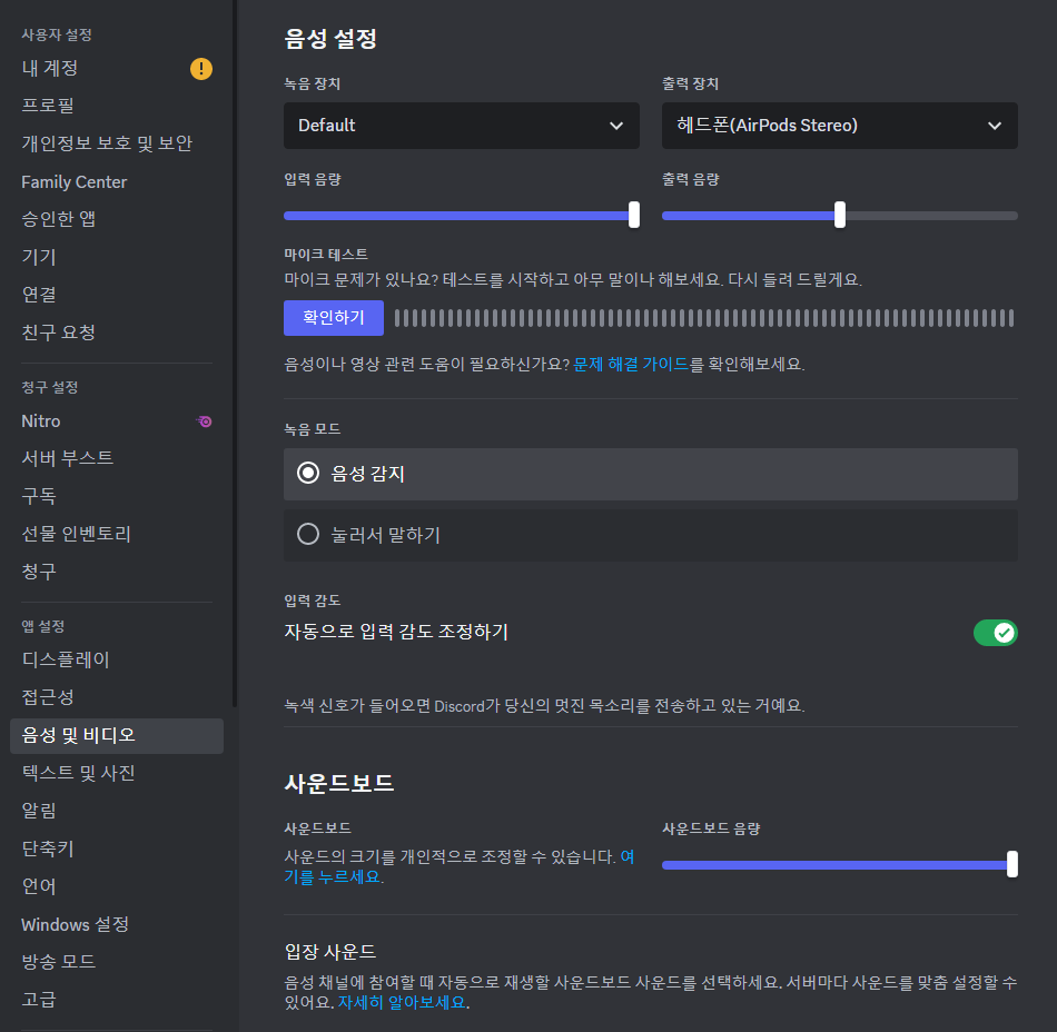 그래서 저는 핸즈프리모드를 끄고 일반 이어폰모드로만 이용합니다. 그런데 이때 문제가 발생합니다. 게임소리, 일반pc사운드는 다 들리는데 디스코드 소리만 안들립니다.