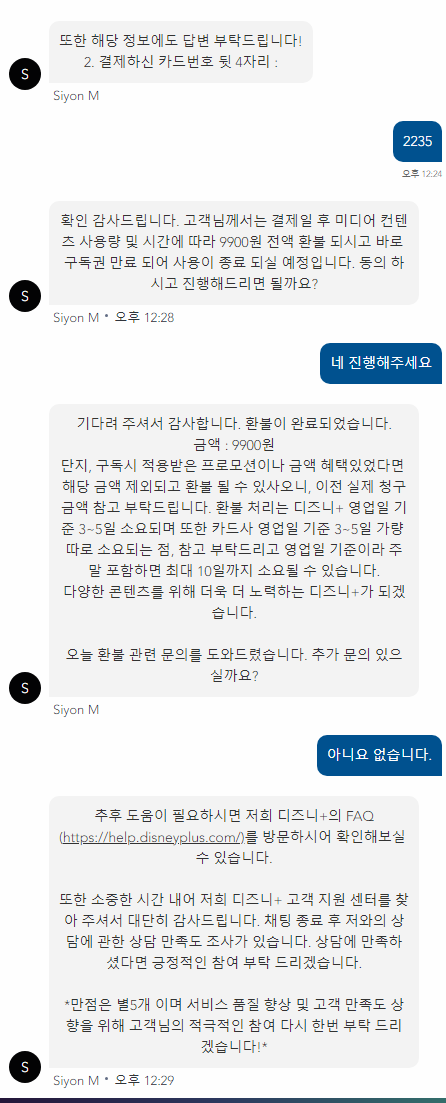 디즈니+를 1년 프로모션으로 이용하고 10월30일부로 멤버십이 끝났습니다. 그런데 구독 취소를 신청하지 않아 한달 멤버십(9900원)이 자동결제 되었습니다. 고객센터에 연락하여 환불을 진행했습니다.