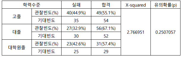 따라서 귀무가설을 기각할 수 없기 때문에 부모의 학력 수준과 자녀의 대학진학 여부와는