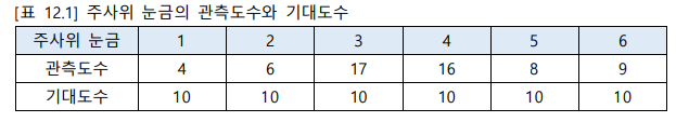 60회 주사위를 던져서 나온 관측도수와 기대도수가 [표 12.1]과 같이 나오는 경우 이 주사위는 게임에 적합한 주사위인지를 일원 카이제곱 검정방법으로 분석한다.