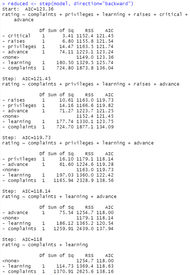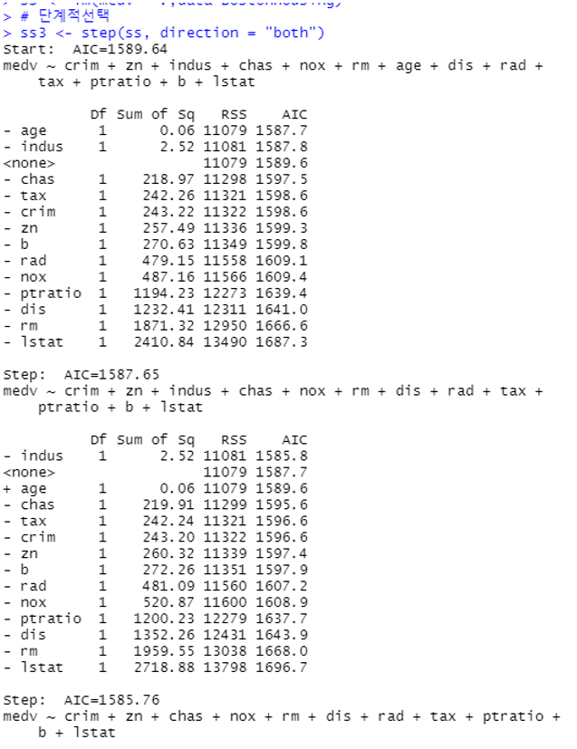 단계선택법(Stepwise selction): 모든 변수가 포함된 모델에서 출발하여 기준 통계치에 가장 도움이 되지 않는 변수를 삭제하거나, 모델에서 빠져 있는 변수 중에서 기준 통계치를 가장 개선시키는 변수를 추가. 이렇게 변수의 추가 또는 삭제를 반복. 또는 절편만 포함된 모델에서 시작해 변수의 추가, 삭제를 반복할 수 도 있다.