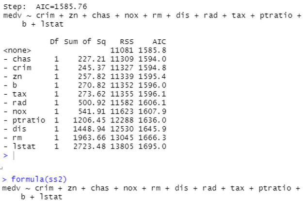 13개의 독립변수로 시작 (AIC값: 1,589.64) --> age변수 제거(AIC값: 1587.65) --> indus변수 제거(AIC값: 1,586.75) --> 최종 회귀식