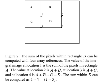 위치 1의 적분 이미지 값은 사각형 A의 픽셀 합계입니다. 위치2는 A+B, 위치3은 A+C, 위치4는 A+B+C+D입니다.