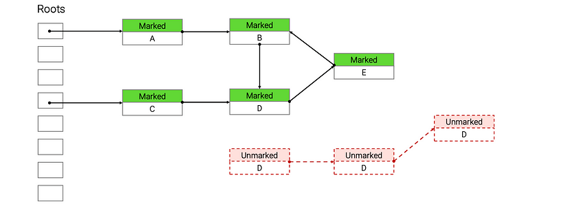 우선 Roots란 글로벌 변수/ 지역 변수/ 스택 프레임/ 레지스터 등에 저장된 변수에서 출발하는 지점을 뜻합니다. Mark 단계에서는 해당 변수에서 출발해서 모든 도달 가능한 객체(Reachable Object)를 탐색한 후 Mark합니다. 위 예시에서는 각각 A,B,C,D,E 객체가 marked 되었고