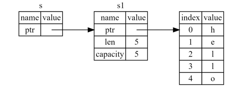 ptr 에서 실제 값을 참조하고 있고 len과 capacity는 각각 메모리 상에서 값이 어느 정도 크기로 참조하는지 나타냅니다. 변수를 대입할 때 참조를 복사하는게 아니라 값을 복사해버리면 동일한 객체가 여러개 존재하게 되서 매우 비효율적인 프로그램이 됩니다.