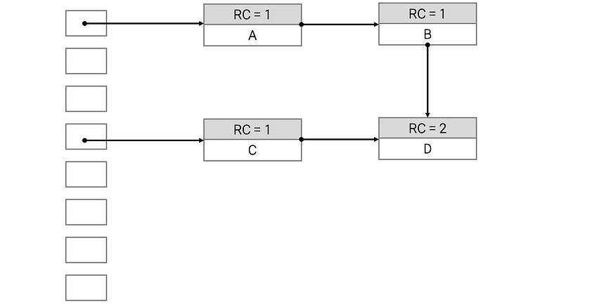 위 객체 중 D의 RC값은 2입니다. C로부터도 참조되고 있구요, B에서도 참조되고 있습니다. 만약 변수의 참조가 사라진다면 연쇄적으로 RC의 값이 줄어들게 됩니다. 아래 그림에서는 A의 참조가 사라진 경우 입니다. A의 값은 0이되고 메모리에서 해제됩니다. 마찬가지로 B도 자신을 참조하고 있는 객체가 없으니 RC의 값이 1 감소하고, 값이 0이 되므로 메모리에서 해제됩니다.