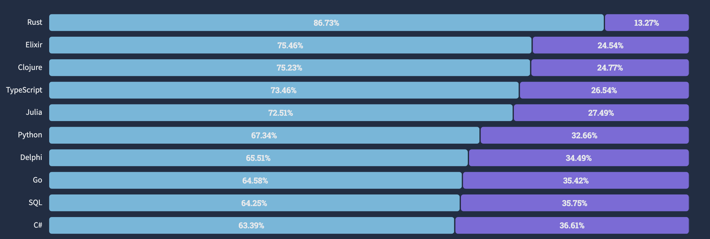 러스트는 높은 추상성으로 높은 생산성을 가지고 있는 동시에 C/C++의 99%에 가까운 성능을 가지고 있어서 빠른 연산속도가 필요한 분야에서 각광받고 있습니다. 2022년 스택오버플로우 개발자 설문조사의 "Loved vs Dreaded(사랑하는 언어 대 두려운 언어)"에서 러스트는 86.73%라는 높은 비율로 가장 사랑받는 언어로 선정되었습니다. 참고로, 러스트는 현재 7년 연속 가장 사랑받는 언어 1위로 선정되었습니다.