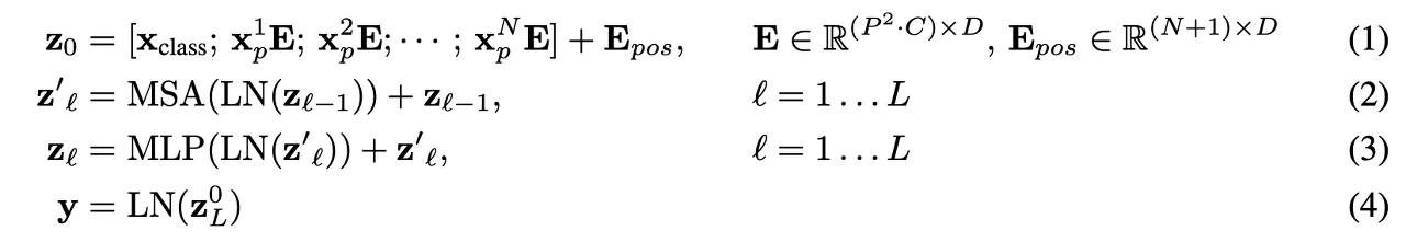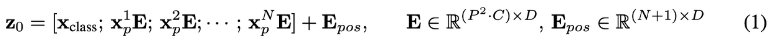 z0는 입력 벡터입니다. Xclass는 클래스 토큰입니다. {Xp}^{N}E는 patch로 나눈 각각의 이미지 시퀀스입니다. 마지막 Epos는 각각 시퀀스의 순서를 나타내는 Positional Encoding입니다.