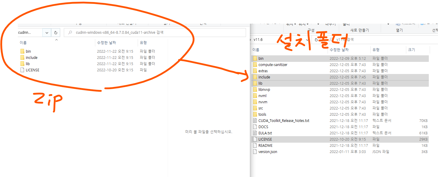 다운받은 zip파일을 cuda가 설치된 폴더에 통째로 압축 풀어주면 된다.