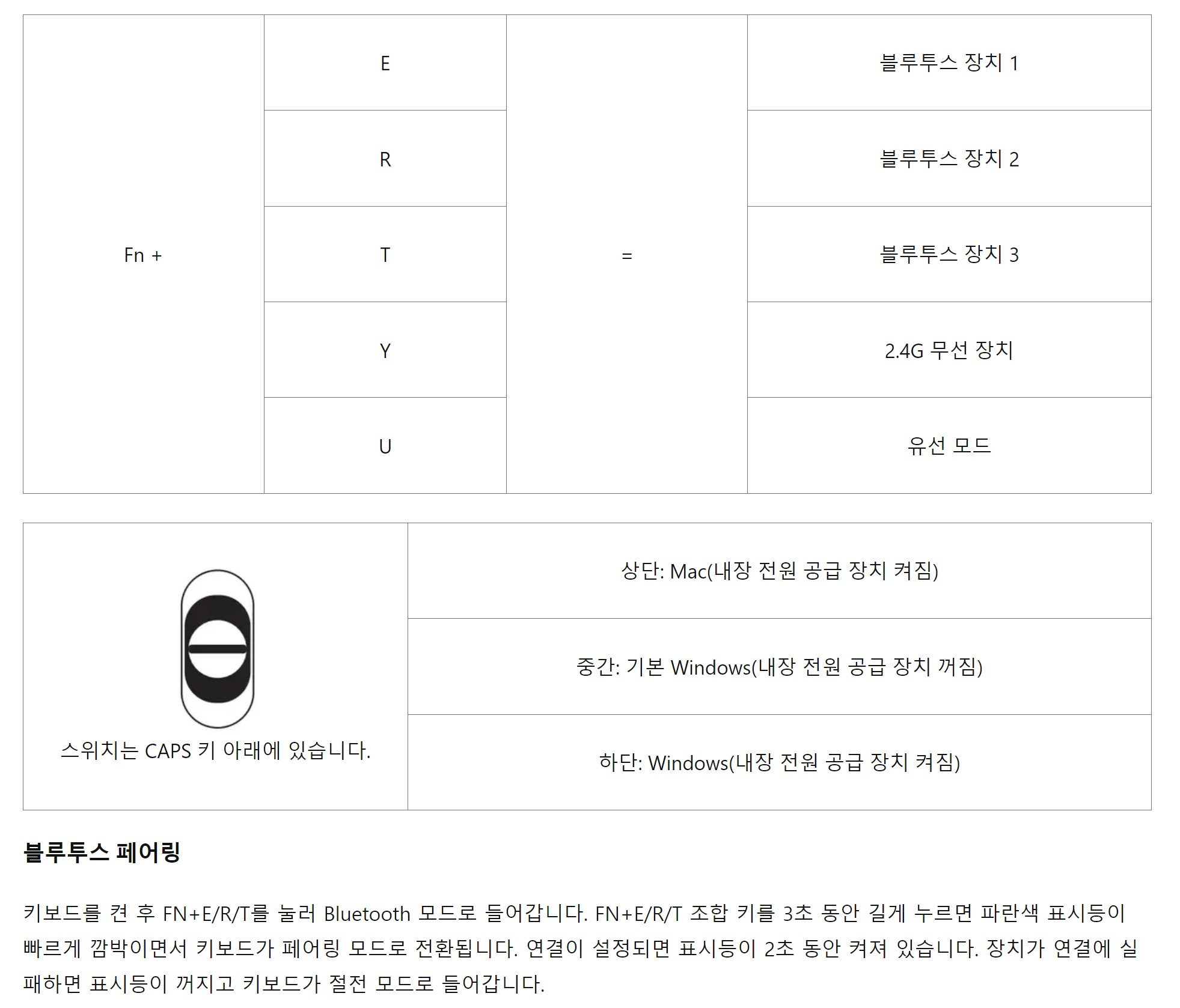 FN+E/R/T/Y로 블루투스123, 2.4G모드를 선택해서 사용하면 됩니다.